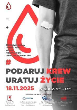 Komenda Powiatowa Policji w Opolu Lubelskim informuje o terenowej akcji honorowego oddawania krwi pod hasłem "Podaruj krew, uratuj życie", organizowanej przez Regionalne Centrum Krwiodawstwa i Krwiolecznictwa w Lublinie. Akcja odbędzie się już jutro 18 listopada 2025 roku w godzinach 09:00-13:00 na parkingu przy Urzędzie Miejskim w Opolu Lubelskim.