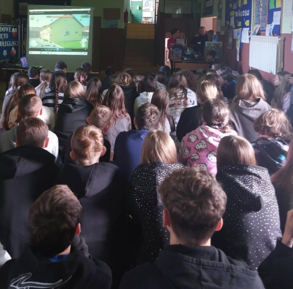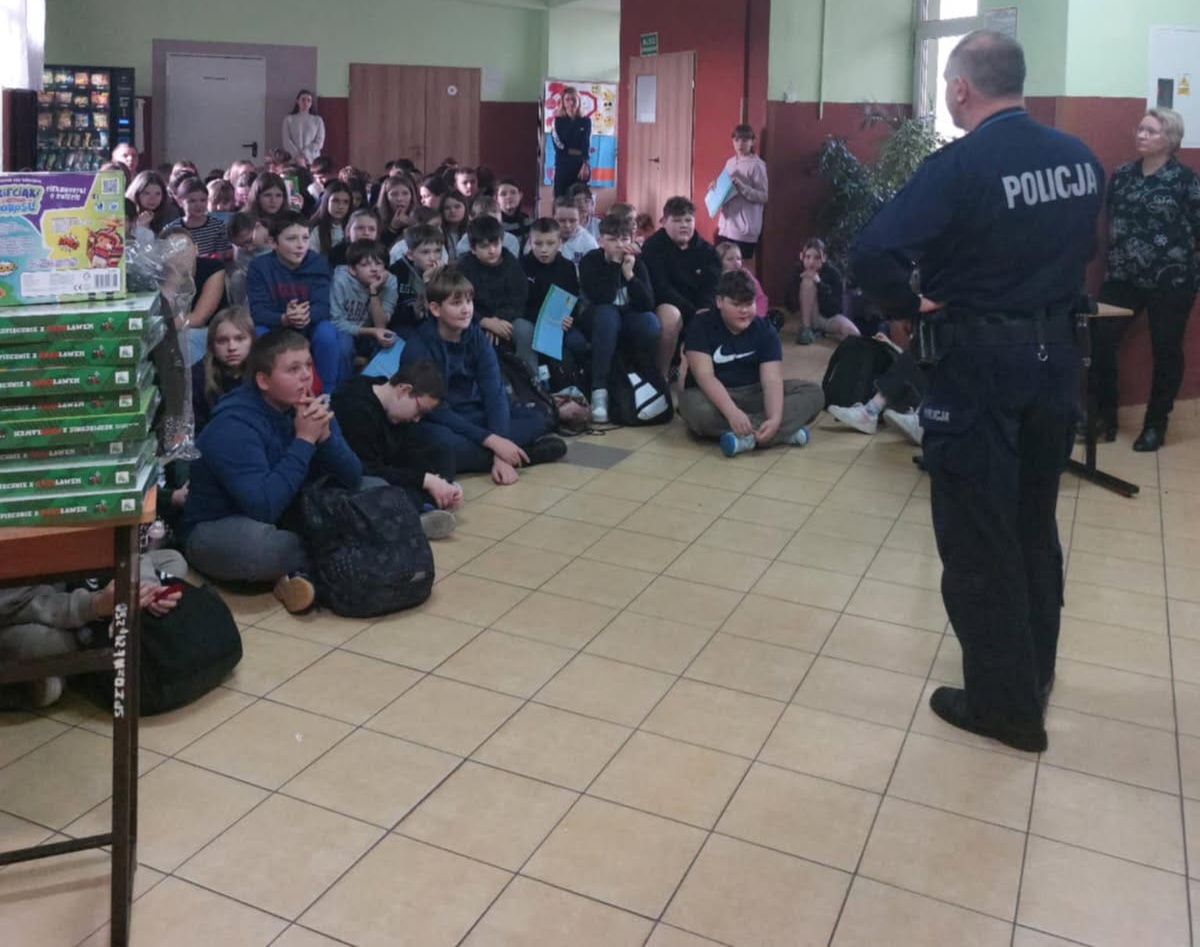 Policjant zwrócił uwagę na zasady bezpiecznej zabawy i przebywania w gospodarstwie rolnym podczas pomocy rodzicom. Poruszył również temat cyberprzemocy.